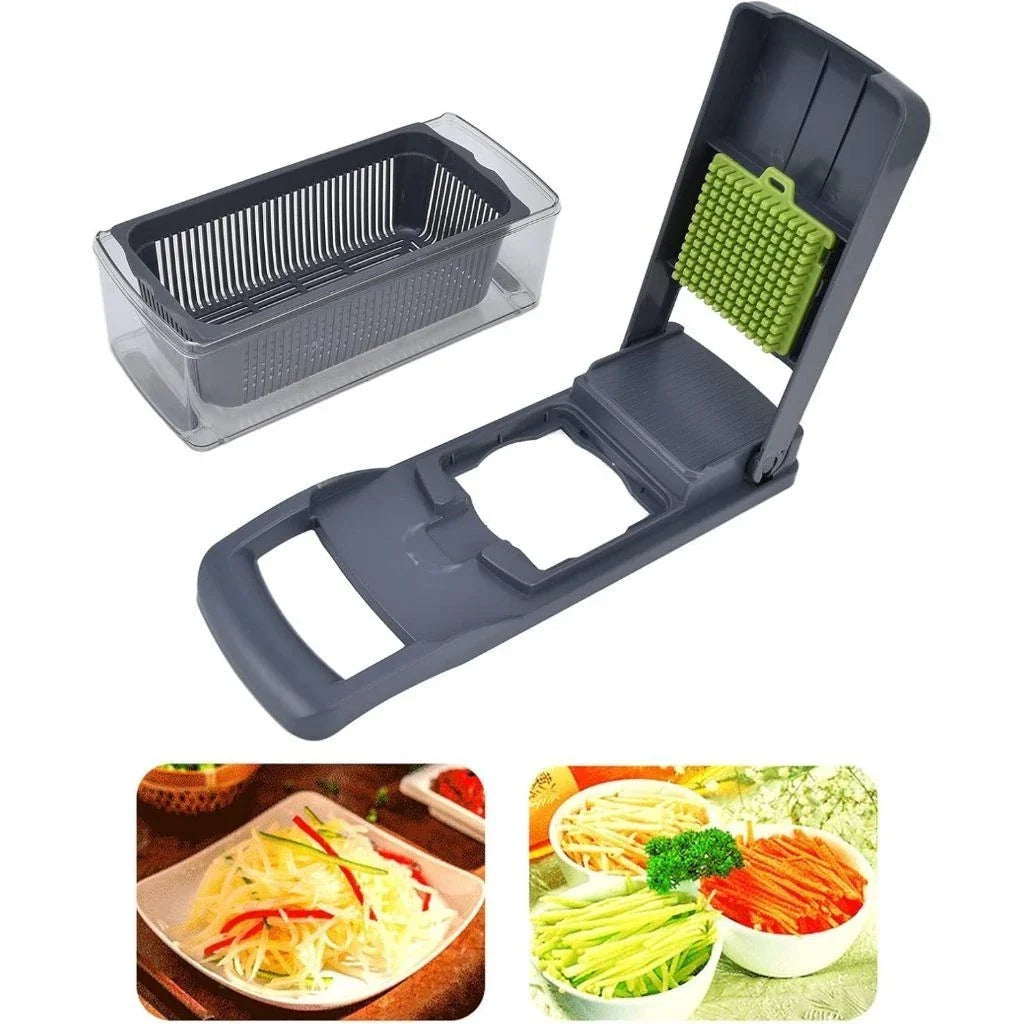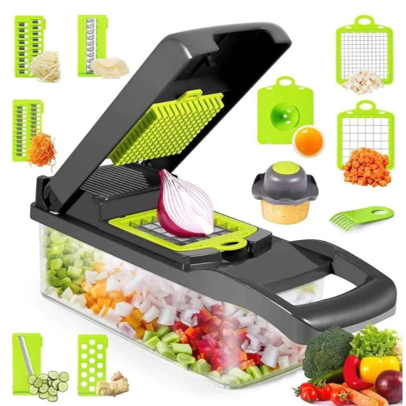 Com design inteligente e lâminas afiadas de alta qualidade, este utensílio permite cortar, fatiar e picar frutas, verduras e legumes de maneira rápida e precisa, economizando tempo e esforço.